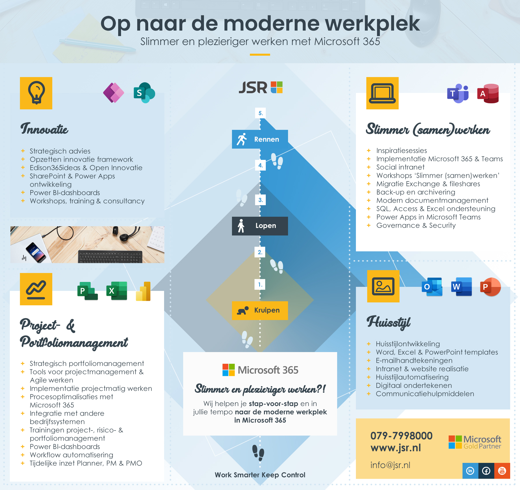 JSR helpt organisaties slimmer gebruikt te maken van Microsoft 365. Wij zijn inmiddels de specialist op het gebied van efficienter en effectiever (samen)werken binnen teams en projecten.