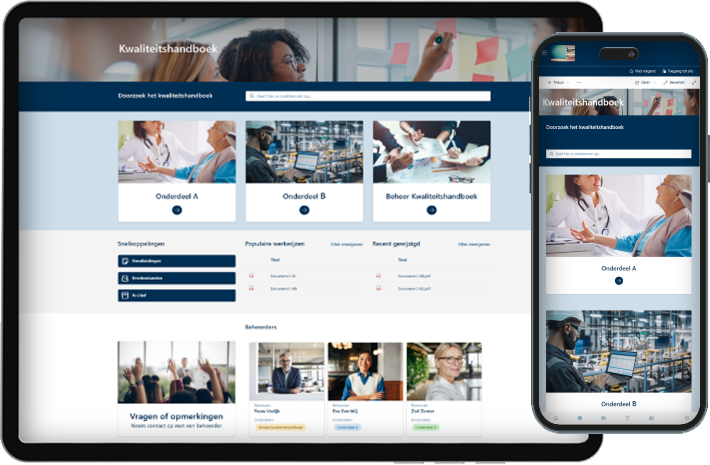 Bij het opzetten van het kwaliteitshandboek houden we het aan de voorkant zo simpel mogelijk. Wat is het belangrijkste? Het snel en eenvoudig vinden van documenten, zowel met een PC, laptop of mobiel. De zoekbalk heeft daarom een prominente plaats op de startpagina. Om zo goed mogelijk zelfstandig aan de slag te kunnen gaan zijn er pagina’s met handleidingen voor gebruikers, auteurs en beheerders beschikbaar.