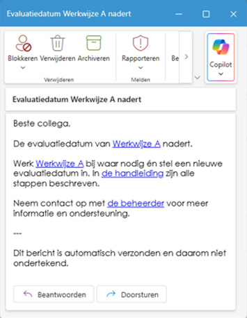 Door het inzetten van Power Automate zijn er rondom de evaluatiedatum automatisch e-mails verzonden die verschillende auteurs en beheerders waarschuwen wanneer de evaluatiedatum van een document nadert of is verstreken.