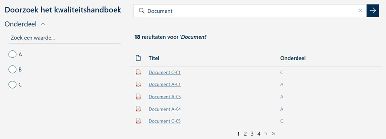 Bij gebruikers van het handboek ligt de focus op het snel kunnen vinden van de juiste documenten. Door gebruik te maken van een krachtige zoekfunctie met uitgebreide filtermogelijkheden voor snelle en nauwkeurige resultaten vind je snel precies wat je zoekt, zonder gedoe.